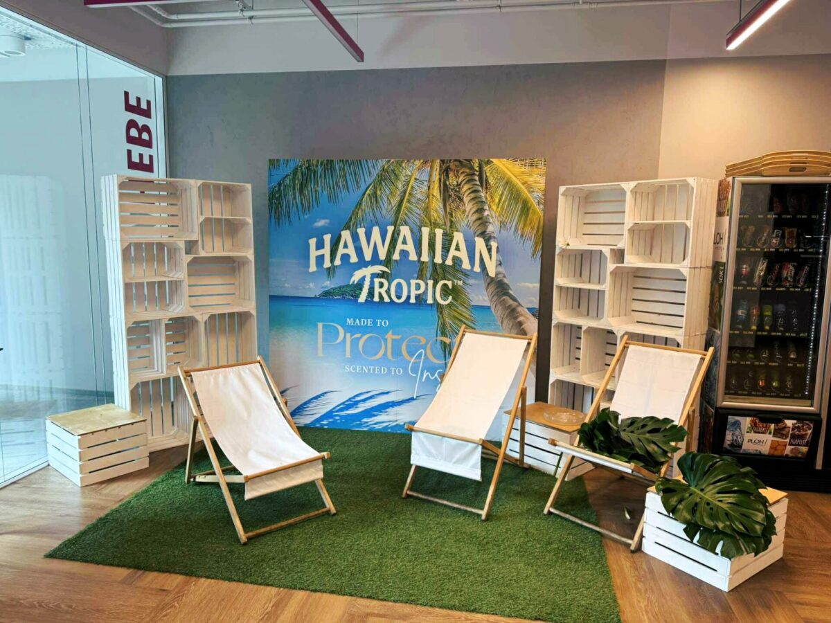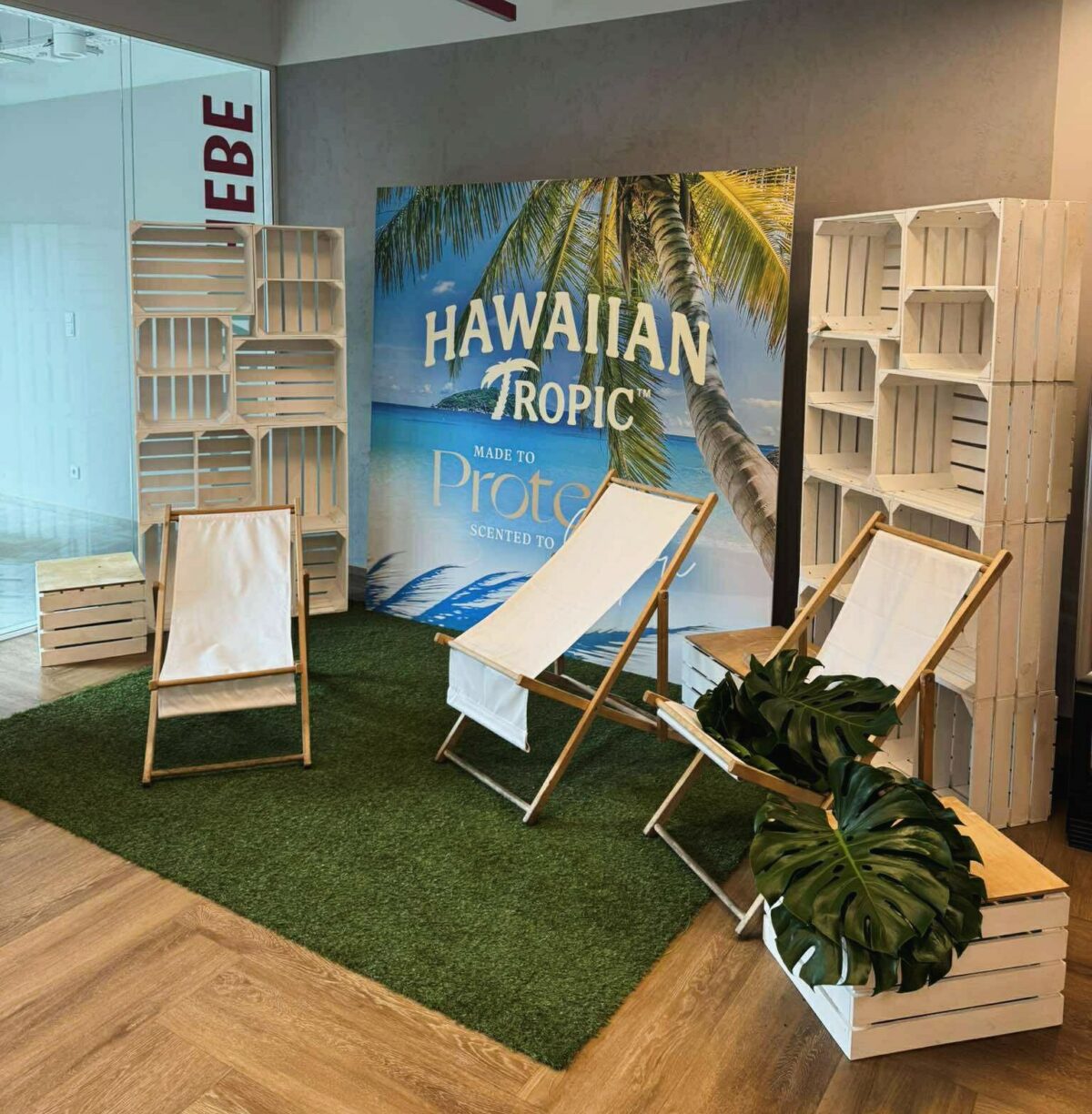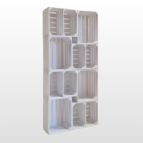 Efektowny wysoki regał z bielonych drewnianych skrzynek, wysokość 180 cm, kolor biały, naturalne drewno, do wnętrz i na zewnątrz, idealny na eventy promocyjne, targi, festyny i garden party.
